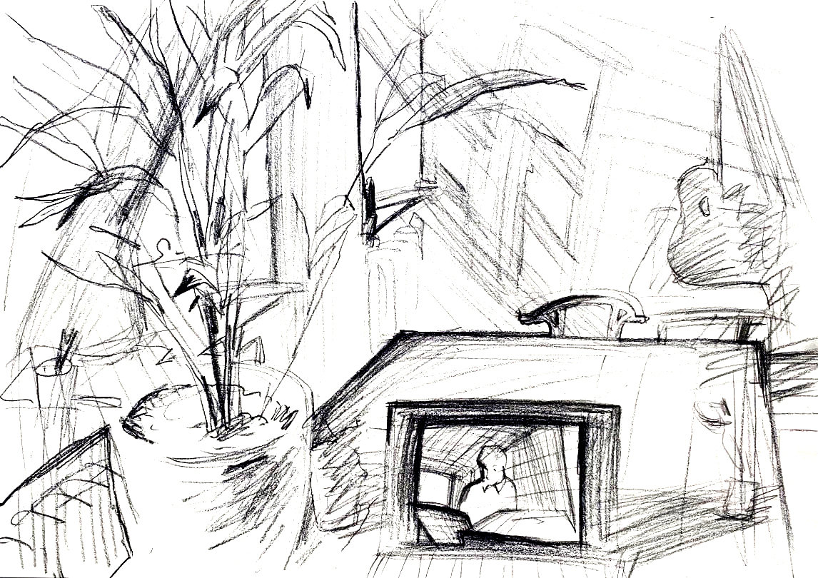 Начинаем с очень широкого штриха сквозь лист. Закладываем им ритм и композицию. Разнообразным штрихом проявляем рисунок. Натура — интерьер. Формат — А2