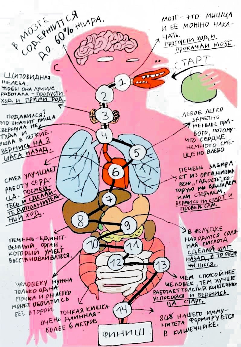 Смотрим короткий детский фильм про анатомию человека. Время от времени останавливаемся, делаем зарисовки разных органов и слушаем интересные факты от ведущей. Из того, что получилось, создаем игру в виде человека: делаем поле, пишем задания, мастерим фишки и кубик. В конце занятия играем.